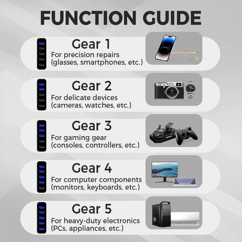 5-SPEED ADAPTABILITY: Speed 1: Phones | Speed 2: Watches, Cameras | Speed 3: Models, Gaming Consoles | Speed 4: Monitors, Keyboards | Speed 5: PCs, Home Appliances. Adjustable torque ensures perfect handling for any project.