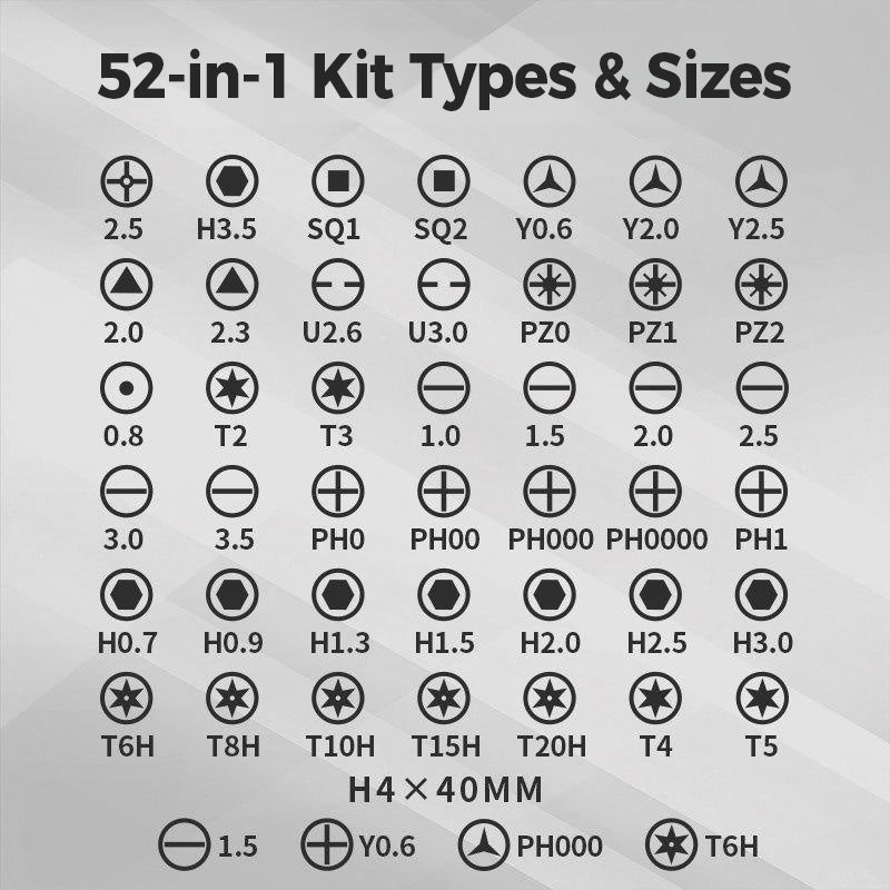 52-IN-1 VERSATILITY: This all-in-one kit includes precision bits, covering everything from delicate electronics to heavy-duty appliances. Whether you're repairing smartphones, watches, cameras, or even home appliances, this set eliminates the need for multiple tools. The organized selection ensures you always have the right bit for the job, saving time and frustration.