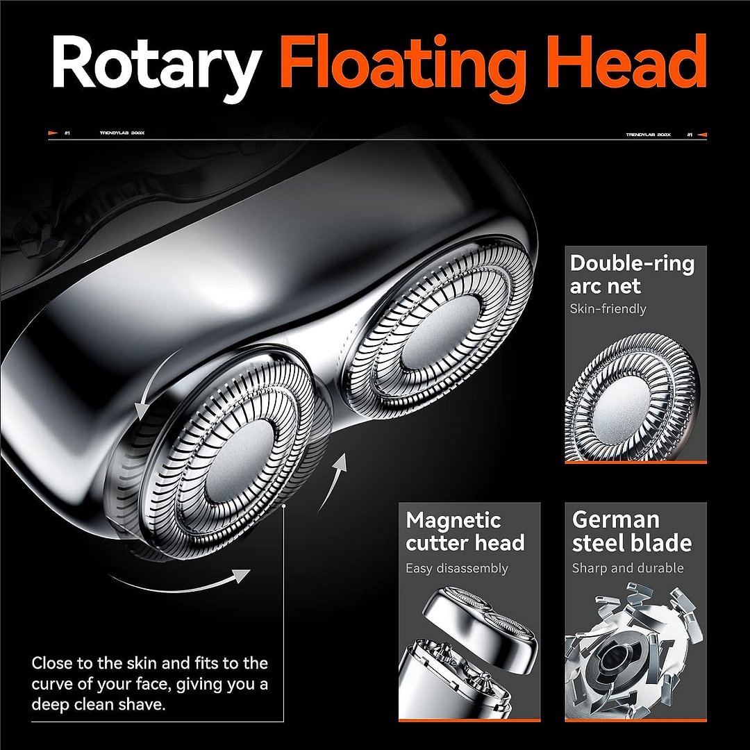 Sharp rotating stainless steel blade, specially designed for hard beards, 0.1mm thick stainless steel blade, double ring 3D blade mesh, increased shaving volume, smooth floating curved surface removes hair from your skin.