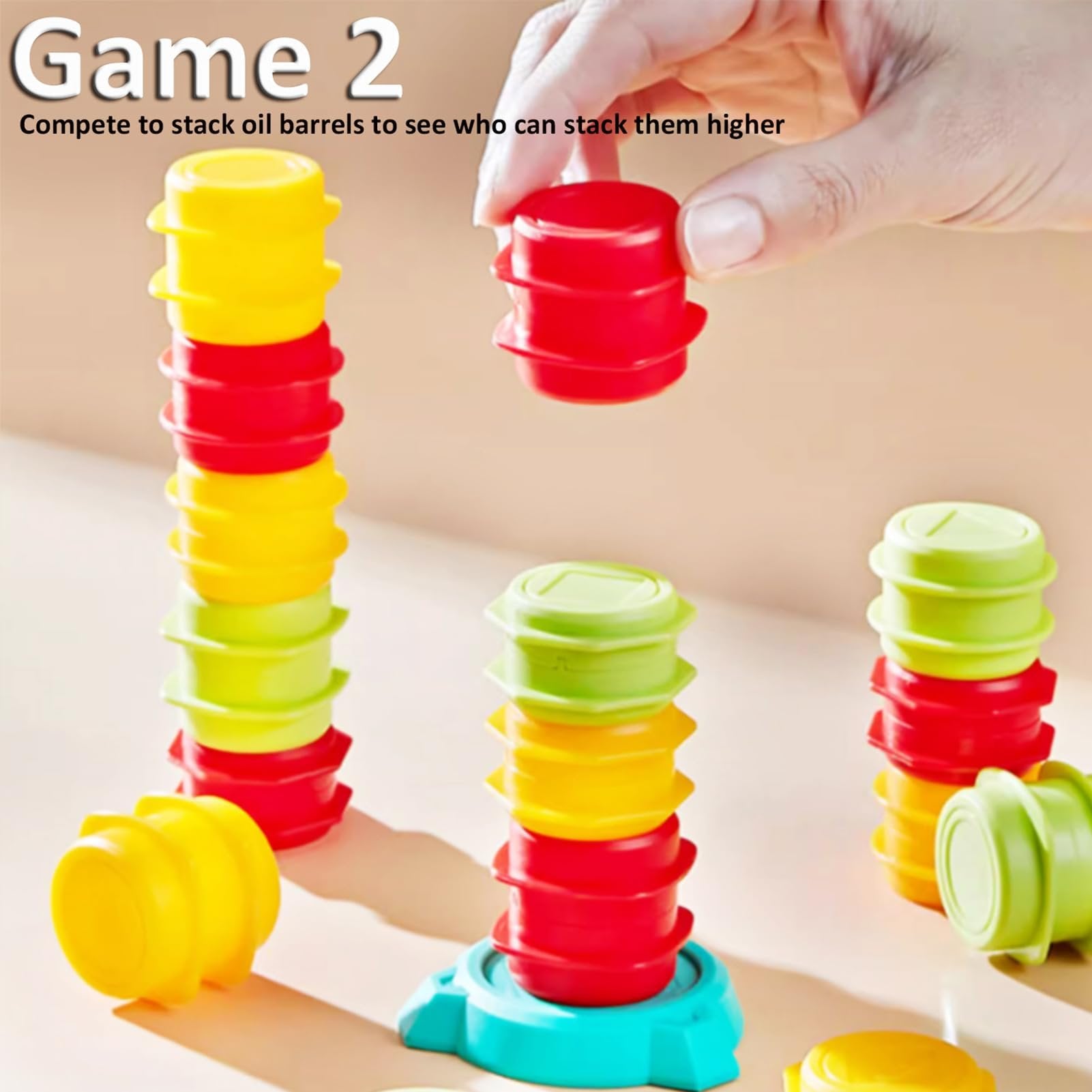 ćHow to Playć:Ā Game 1: Simple and easy to play, randomly turn over the cards, stack the oil barrels according to the cards, transport the oil barrels to the designated location, put down the oil barrels, whoever runs faster wins. Stack the oil barrels according to the cards and transport them to the designated location, press the bell to win! Game 2: See who can stack the oil drums higher!