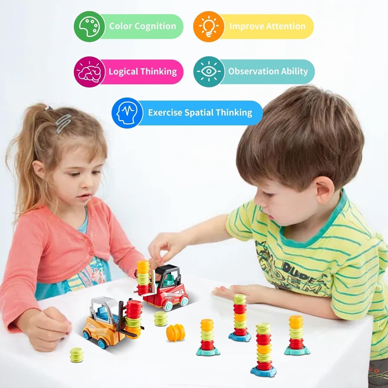 ćTraining Skillsć:Ā Forklift transport game can help children recognise colours and shapes, promote and train children's imagination and creativity, as well as improve their practical skills, thinking and problem solving skills, structural elements and design skills.